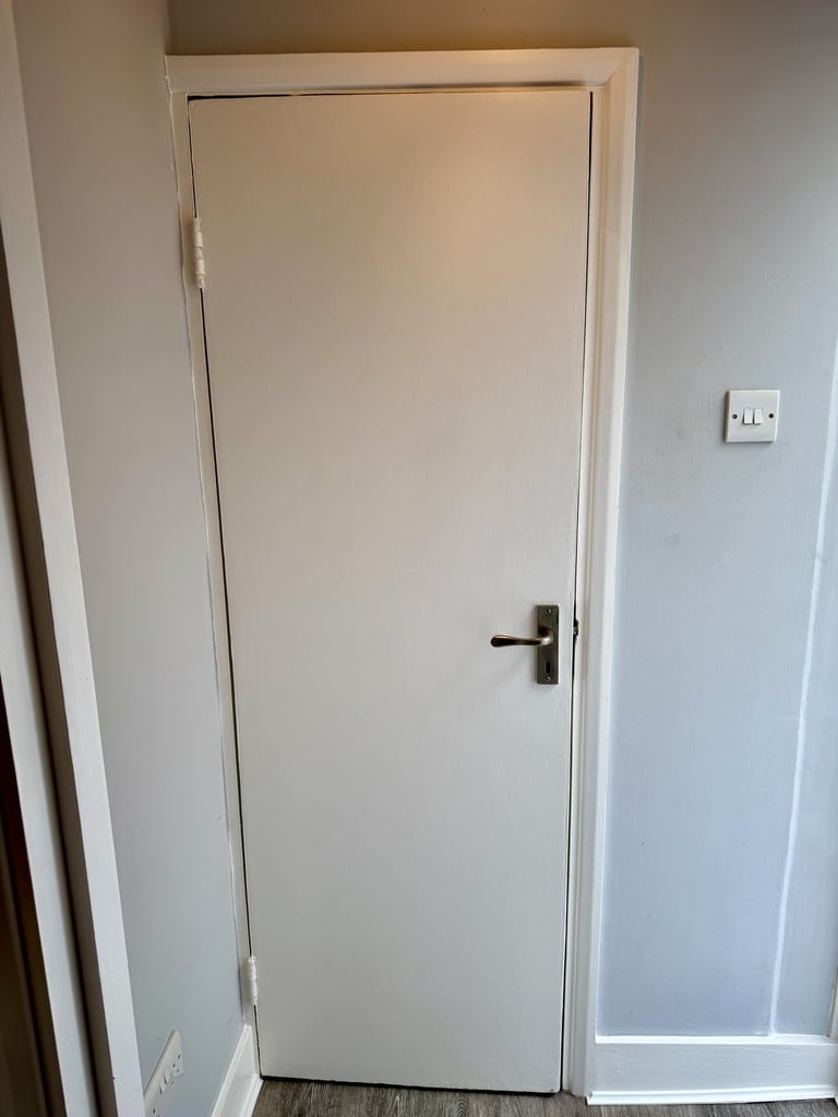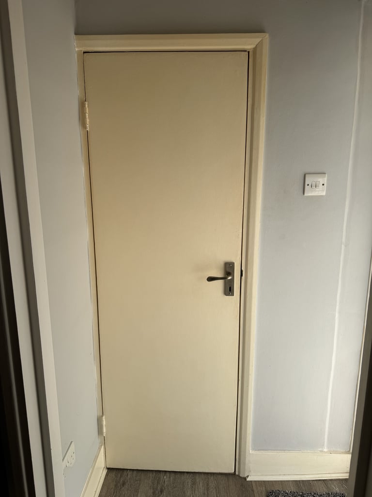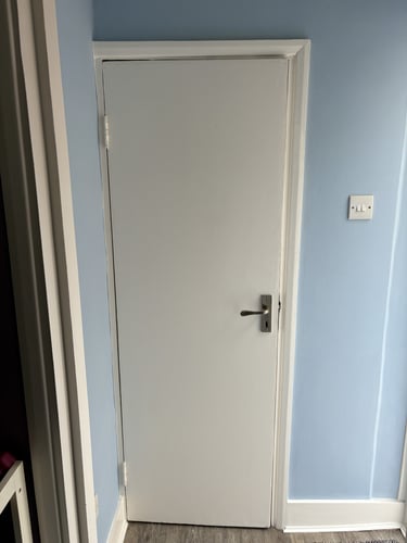 Some progress shots of the door into the hallway. All the woodwork was Jasmine White, again by Dulux. This neutral has a hint of creaminess, so isn't a stark white. However, in the second picture, you can really see how much fresher the frame looks compared to the door, which was still yet to be painted.