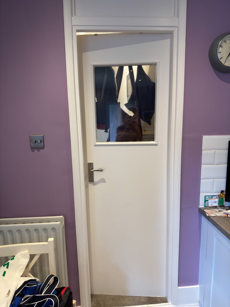 I can only assume it means something like ultra-neat tradesman, because after finishing the kitchen, I was offered more work around the house. Here is a before and after of the bathroom door.
